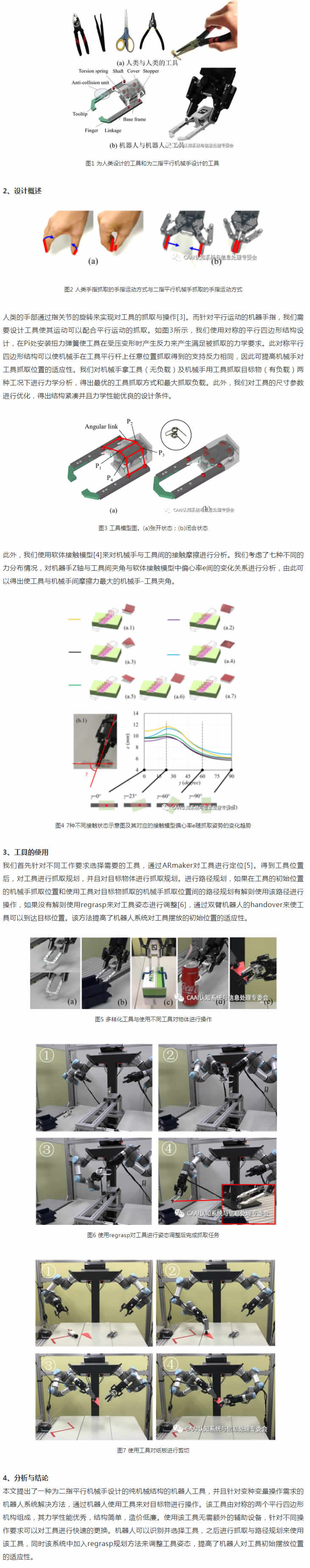 現(xiàn)代自動(dòng)化生產(chǎn)中要求機(jī)器人系統(tǒng)具備一定柔性以適應(yīng)變種變量的生產(chǎn)需求。例如在機(jī)器人分揀及組裝中,機(jī)器人需要快速處理各式不同的物體。使機(jī)器人系統(tǒng)可以穩(wěn)定并且低成本的操控多種目標(biāo)物體是實(shí)現(xiàn)新一代G效自動(dòng)化生產(chǎn)的重要研究目標(biāo)。目前機(jī)器人系統(tǒng)針對多種物體的操作,主要通過機(jī)械手/手指更換設(shè)備或多功能機(jī)械手來實(shí)現(xiàn)[1][2]。然而機(jī)械手/手指更換設(shè)備需要部署輔助控制設(shè)備和外部能源供給,這增加了系統(tǒng)的復(fù)雜度。同時(shí),設(shè)備的控制與供能需要引入電纜或氣管,這會(huì)對機(jī)械臂的自由靈活運(yùn)動(dòng)產(chǎn)生干擾。此外,多功能機(jī)械手僅可適用于一定范圍的操作任務(wù)。對此,我們提出了讓機(jī)器人使用不同工具來操作多樣化目標(biāo)物的方法。這里提到的工具并不是機(jī)器人學(xué)中對終端執(zhí)行器的稱呼,而是同人類使用的鑷子,剪刀等工具一樣的可以被機(jī)械手直接控制的工具。此工具為復(fù)雜的變種變量的操作任務(wù)提供了一項(xiàng)有效的解決方案,它有如下特征:(1) 通過機(jī)械機(jī)構(gòu)實(shí)現(xiàn)機(jī)械手到工具的動(dòng)力傳遞,無需外部控制及供能;(2)結(jié)構(gòu)緊湊,對機(jī)器人的避障路徑規(guī)劃影響J。(3) 通過設(shè)計(jì)不同的工具先端實(shí)現(xiàn)可以對多種任務(wù)進(jìn)行有效配適,在更換工具時(shí)僅需要對目標(biāo)工具進(jìn)行一次抓取;(4)純機(jī)械機(jī)構(gòu)設(shè)計(jì),成本低廉,可靠性強(qiáng)。