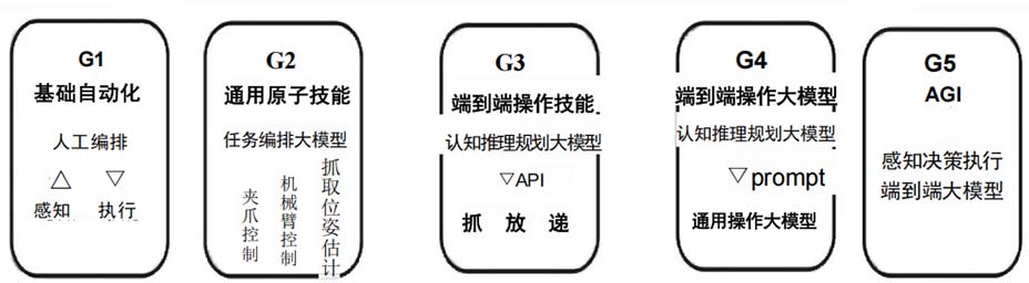 同時(shí),智元還定義了G1 至 G5 的具身智能技術(shù)演進(jìn)路線。G1 主要針對特定場景;G2 面向更多場景任務(wù), 具有一定的泛化能力;G3 從原先的算法驅(qū)動(dòng)轉(zhuǎn)變?yōu)閿?shù)據(jù)驅(qū)動(dòng);G4 引入了仿真數(shù)據(jù)和世界模型;G5 致力于 從感知到執(zhí)行,具備G度的自主性和適應(yīng)性。目前智元處于G2和G3階段,已在G2路線取得階段性突破, 實(shí)現(xiàn)了UniPose、UniGrasp、UniPlug 的通用原子模型,G3 路線上也形成了全流程具身數(shù)據(jù)方案AIDEA。