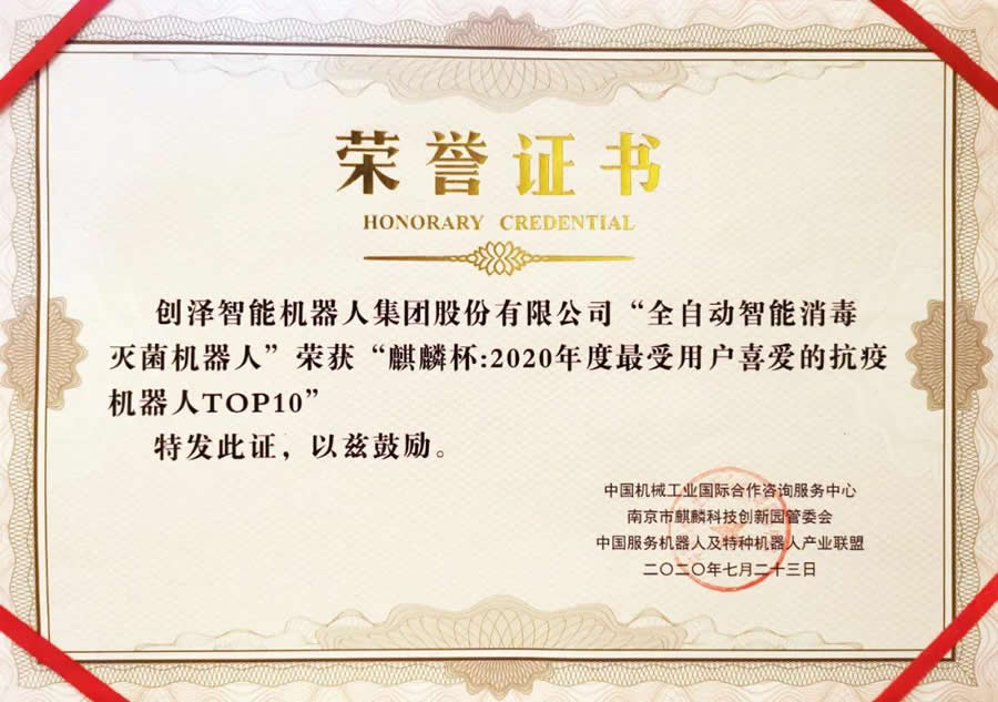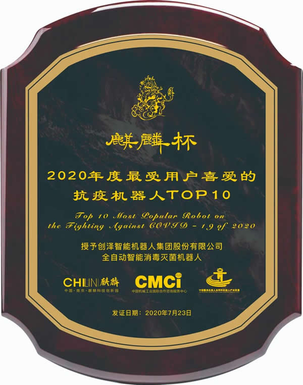 2020年7月23日,由機械工業(yè)國際合作咨詢服務中心、南京麒麟科創(chuàng)園管委會、服務機器人及特種機器人產(chǎn)業(yè)聯(lián)盟聯(lián)合主辦的2020第六屆國際服務機器人產(chǎn)業(yè)G峰論壇暨“第三屆麒麟杯頒獎典禮在南京舉行。此次典禮上,智能服務機器人L軍企業(yè)創(chuàng)澤集團被授予“麒麟杯:2020年度受用戶喜愛的抗疫機器人TOP10”榮譽證書。