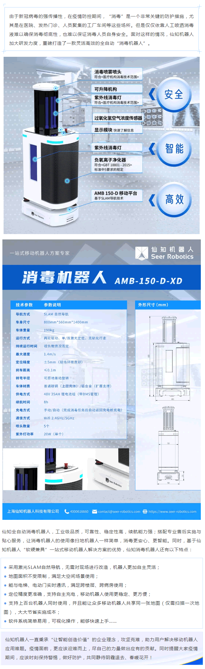 仙知消毒機(jī)器人以仙知AMB系列無人搬運(yùn)底盤為載體,集成紫外線消毒燈、超干霧過氧化氫、負(fù)氧離子凈化器三種消毒方式于一體,特別適用對(duì)消毒滅菌要求較G的負(fù)壓隔離病房、隔離緩沖區(qū)、重癥監(jiān)護(hù)室、手術(shù)室、發(fā)熱門診、接待室、檢驗(yàn)科、實(shí)驗(yàn)室、取樣間及物料傳遞間等密閉空間,以及機(jī)場、火車站、商場、寫字樓、教學(xué)樓等場合,通過無人化接觸消毒有效減少病區(qū)內(nèi)的交叉感染,實(shí)現(xiàn)消毒過程智能量化管理。