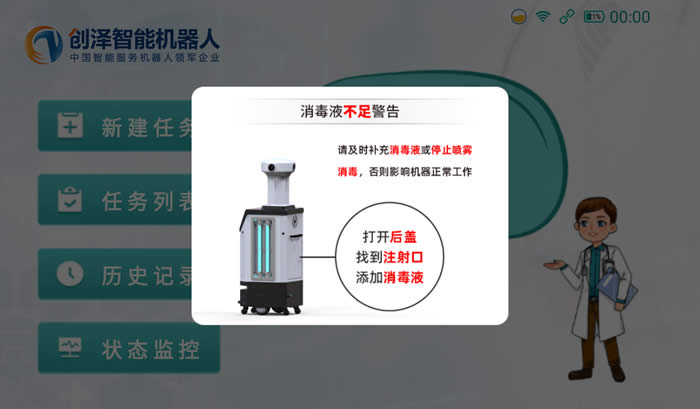 消毒機(jī)器人的屏幕還可以顯示消毒機(jī)器人運行過程中的狀態(tài)提醒,如上圖所示,當(dāng)消毒機(jī)器人的消毒液不多的時候,會在屏幕顯示添加消毒液的提醒信息。
