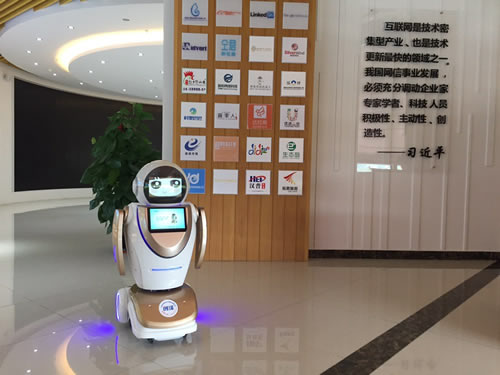智能迎賓機器人正在工作區(qū)域待命,正在等待您的到來。