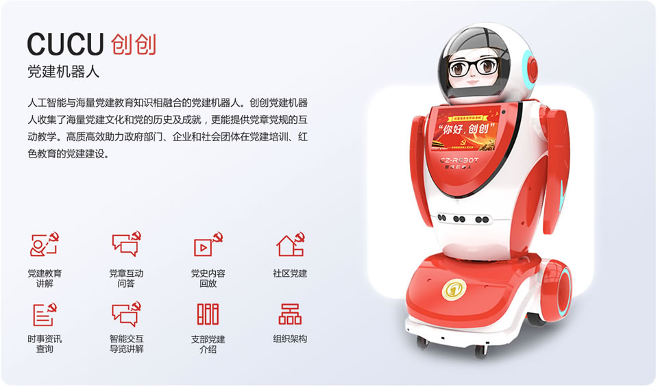 黨建導(dǎo)覽機器人是人工智能+黨建教育的創(chuàng)新應(yīng)用,積J探索人工智能在黨建教育L域的廣泛適應(yīng)性,擴展黨建教育渠道,助力智慧黨建建設(shè)。主要運用了語音識別、語義分析、智能回復(fù)、急速響應(yīng)、人臉識別、視覺傳感、深度語音交互、自由行走、智能避障、自主充電等技術(shù),幫助政府部門、企業(yè)和社會團體加強在黨建培訓(xùn)、紅色教育等方面人工智能應(yīng)用。
