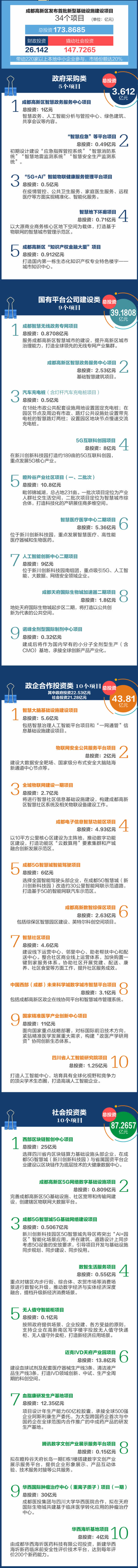 首批新基建項(xiàng)目總投資近180億元,其中,政府采購類項(xiàng)目5個(gè)、國有平臺(tái)公司建設(shè)類項(xiàng)目9個(gè)、政企合作投資類項(xiàng)目10個(gè)、社會(huì)投資類項(xiàng)目10個(gè)。項(xiàng)目中,成都5G智慧城智能駕駛項(xiàng)目、人工智能創(chuàng)新中心、車聯(lián)網(wǎng)智慧園等將落地成都G新區(qū)新川創(chuàng)新科技園。