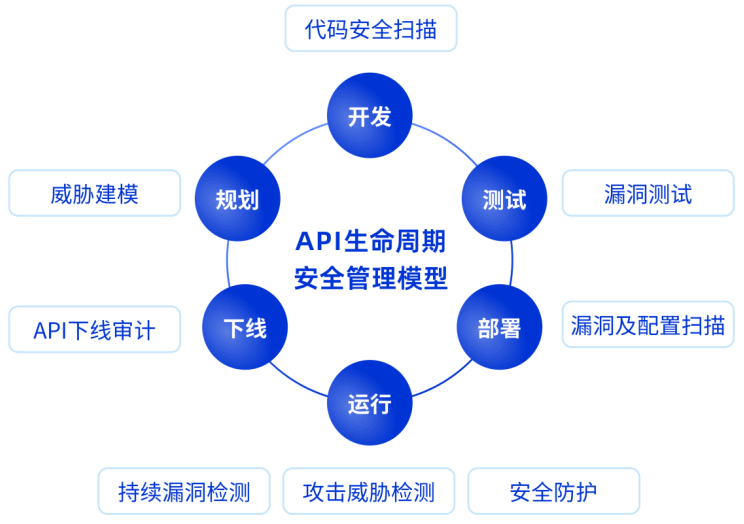 其次,API在整個業(yè)務(wù)生命周期當(dāng)中變化非常快,API實現(xiàn)邏輯一旦發(fā)生變化,很容易引入新的風(fēng)險。因此,從API全生命周期來考慮API安全,圍繞規(guī)劃、開發(fā)、測試、部署、運行到下線的每一個環(huán)節(jié)加強安全建設(shè)顯得尤為重要。