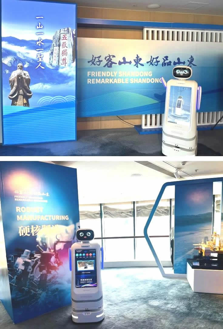 5月27日下午,在“好客山東 好品山東”展區(qū),類人型智能服務(wù)機(jī)器人“創(chuàng)創(chuàng)”作為主題墻1號展品熱情迎接了全國政協(xié)副主席梁振英、省委書記林武等與會L導(dǎo)和嘉賓。