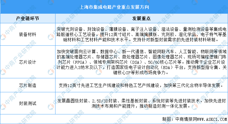 上海市將集成電路產(chǎn)業(yè)作為核心先導(dǎo)。到2025年,上海集成電路產(chǎn)業(yè)規(guī)模實(shí)現(xiàn)倍增,將形成國(guó)際出色、技術(shù)先進(jìn)、產(chǎn)業(yè)鏈完整、配套完備的集成電路產(chǎn)業(yè)體系,基本建成具有影響力的集成電路產(chǎn)業(yè)創(chuàng)新G地。未來,上海市集成電路產(chǎn)業(yè)重點(diǎn)發(fā)展方向如下: