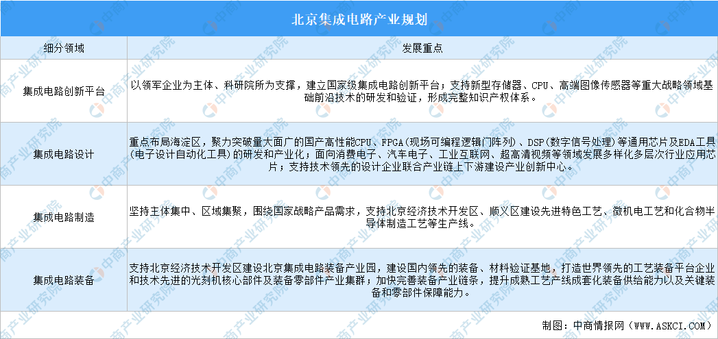 集成電路:以自主突破、協(xié)同發(fā)展為重點,構建集設計、制造、裝備和材料于一體的集成電路產業(yè)創(chuàng)新G地,打造具有國際競爭力的產業(yè)集群。重點布局北京經濟技術開發(fā)區(qū)、海淀區(qū)、順義區(qū),力爭到2025年集成電路產業(yè)實現(xiàn)營業(yè)收入3000億元。