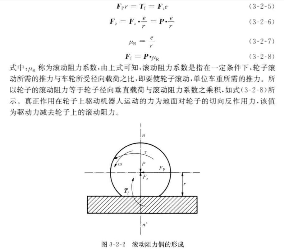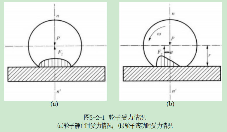 如果將法向反作用力F. 向后平移至通過(guò)輪子中心,與其垂線重合,則輪子在 地面上滾動(dòng)時(shí)的受力情況如圖3-2-2所示,出現(xiàn)一個(gè)附加的力偶矩T=F,e, 這個(gè) 阻礙車(chē)輪滾動(dòng)的力偶矩稱(chēng)為滾動(dòng)阻力偶矩。由圖3-2-2可知,欲使輪子在地面上 保持勻速滾動(dòng),需要在輪軸上加一驅(qū)動(dòng)力矩r 或是加一推力Fp, 從而克服上述滾 動(dòng)阻力偶矩。相關(guān)數(shù)學(xué)關(guān)系如下所示。
