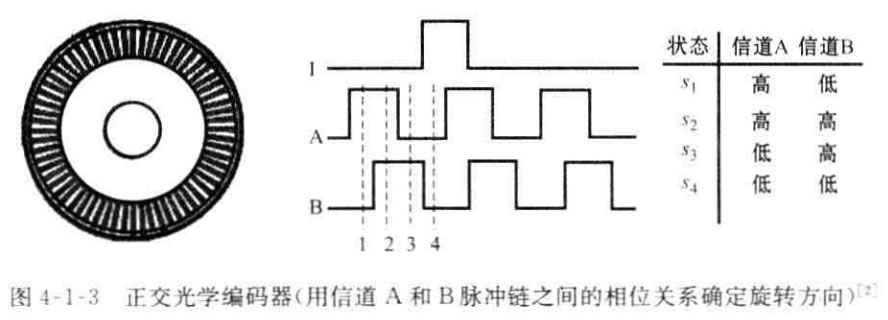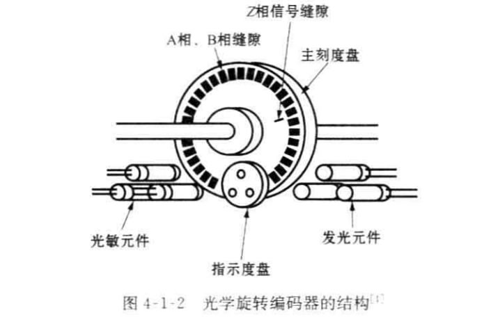 以圖4-1-2為例說明光學(xué)編碼器的結(jié)構(gòu)。光學(xué)編碼器由發(fā)光元件、屏蔽光的固 定光柵、與轉(zhuǎn)軸一起旋轉(zhuǎn)的帶光柵的轉(zhuǎn)盤和固定的光敏元件組成。發(fā)光元件和光敏 元件安放在碼盤的兩側(cè),當(dāng)轉(zhuǎn)盤轉(zhuǎn)動時,根據(jù)固定的和運動的光柵的排列,光敏元件 接收的光通量會發(fā)生變化。光敏元件輸出的波形經(jīng)過整形后形成脈沖,根據(jù)脈沖計 數(shù),可以得到固定在碼盤上的轉(zhuǎn)軸的角位移。在測量中,Z后得到的光強信號用閾 值變換成離散的方波,在亮和暗的狀態(tài)之間作選擇。分辨率以每轉(zhuǎn)周期數(shù)(CPR)度量。Z小的角分辨率可以容易地從編碼器的CPR 額定值計算出。典型的編碼 器可擁有2000 CPR, 而光學(xué)編碼器工業(yè)可容易地制造出具有10000 CPR 的 編 碼 器。當(dāng)然,根據(jù)所需的帶寬,Z關(guān)鍵的是編碼器需要足夠快,以計算期望的軸轉(zhuǎn)速。