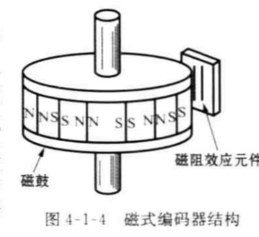 磁式編碼器是通過在強磁性材料表面上等 間隔的磁化刻度標(biāo)尺,標(biāo)尺旁邊相對放置磁阻 效應(yīng)元件或霍爾元件,即能檢測磁通的變化,如 圖4-1-4所示,兩個磁傳感器的距離恰好是磁化 標(biāo)尺間隔的1/4. 因此可以根據(jù)輸出信號的相位 關(guān)系檢測旋轉(zhuǎn)方向。與光學(xué)編碼器相比,磁式編 碼器的刻度間隔大,但它具有耐油污、抗沖擊等 特點。