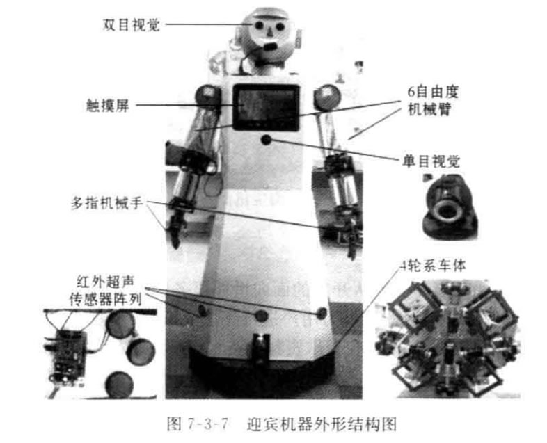 迎賓機器人采用造型活潑的卡通形象,其外形如圖7-3-7所示,頭部有雙目視覺傳感器,身體部分主要包括觸摸屏、機械臂和機械手。身高約1.4~1.5m, 采 用 輪式移動方式,Z高移動速度約18m/min 。 可自主完成接待、導(dǎo)引、語音提示、點 菜等服務(wù)工作。連續(xù)工作時間不小于2小時。主要參數(shù)如下: