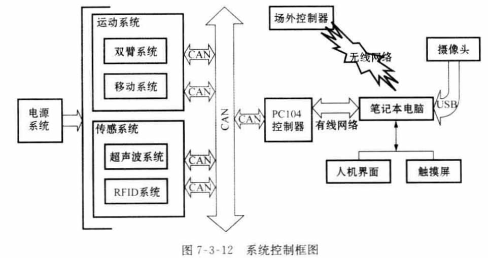 迎賓服務(wù)機(jī)器人系統(tǒng)各硬件模塊主要由CAN 總線(xiàn)連接,通過(guò)統(tǒng)一的CAN 總 線(xiàn)協(xié)議將各模塊簡(jiǎn)單地加載到系統(tǒng)中。系統(tǒng)主要由電源系統(tǒng)、運(yùn)動(dòng)控制系統(tǒng)、傳感 系統(tǒng)等組成,其中運(yùn)動(dòng)控制系統(tǒng)包括雙臂系統(tǒng)及移動(dòng)系統(tǒng),傳感器系統(tǒng)包括超聲波系統(tǒng)、RFID定位系統(tǒng)、視覺(jué)系統(tǒng)組成。