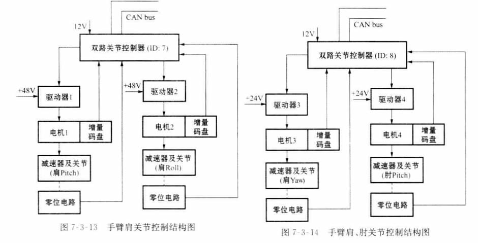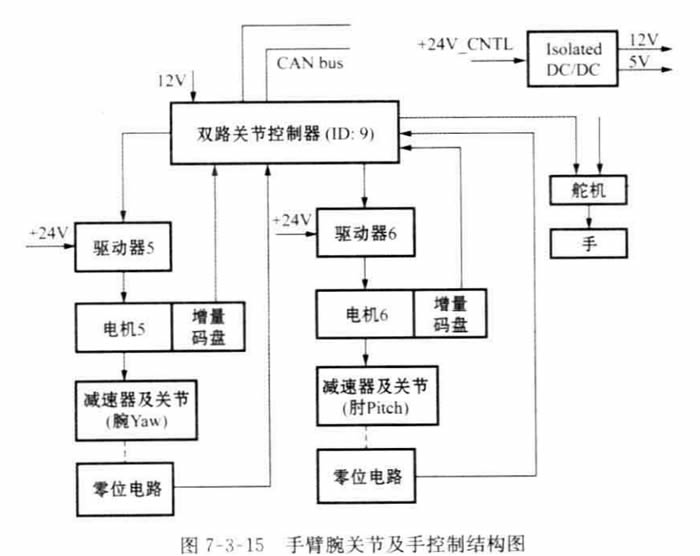 手臂各關(guān)節(jié)控制電路采用分布式控制系統(tǒng),各關(guān)節(jié)控制器(主 MCU 是 TMS320LF2407)由CAN 總線(xiàn)相連(CAN2.0-A 版本)?刂浦芷跒5m (即上位機(jī) 與 所 有 關(guān) 節(jié) 控 制 器 通 信 一 遍 , 再 加 一 定 裕 度 后 的 時(shí) 間 ) 。 各 關(guān) 節(jié) 控 制 電 路 結(jié) 構(gòu) 如 圖7 - 3 - 13、圖7 - 3 - 14及圖7 - 3 - 15所示。