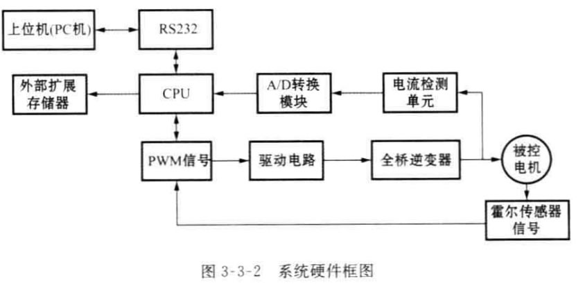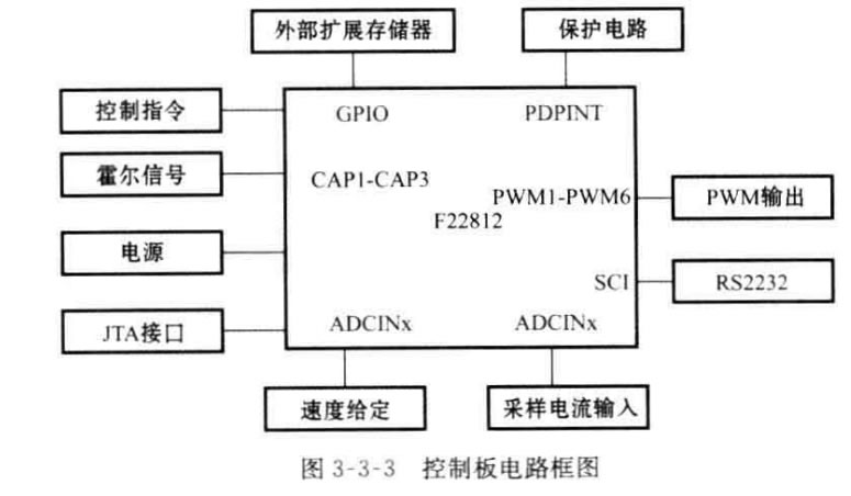 系統(tǒng)的硬件框圖如圖3-3-2所示,可以看出基本上包括一個以TMS320F2812DSP 為核心的DSP 控制板,一塊配套的功率驅(qū)動板和一臺無刷直流電機。實現(xiàn)的 主要功能是控制指令的接收和執(zhí)行,速度信號的接收和計算處理,電流采樣信號接 收和轉(zhuǎn)換,速度閉環(huán)和電流閉環(huán)控制算法的執(zhí)行等。