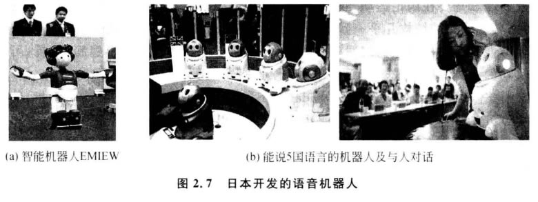 日本日立公司也研制了一臺智能機器人EMIEW, 它的個頭和小孩一樣,依靠輪子移 動,如圖2.7(a)所示。由于身上裝有數(shù)碼相機和雷達(dá)探測器,它可以自動地躲避障礙物。 同時它的詞匯儲備量達(dá)到100多個,能夠?qū)σ恍┖唵蔚穆曇糁噶钭龀龇磻?yīng),并且還能夠 和人進(jìn)行簡單的對話交流,甚至播報天氣預(yù)報等。第二代 EMIEW2 機器人可以通過無 線電裝置接收指令,然后毫不費力地在辦公室之間來回奔波,為辦公室人員跑腿。它站 立時身高大約為31.5英寸,體重為29磅。它能夠?qū)φ系K物應(yīng)付自如,對人的語音做出 回應(yīng),并且一次充電后即可工作1小時。此外,能說5國語言的機器人及與人對話的機 器人也已經(jīng)誕生了,如圖2.7(b) 所示。在我國舉辦的日語演講大賽現(xiàn)場上,參加比賽的 選手以及日語院校的學(xué)生不但與該機器人進(jìn)行了交流互動,而且該機器人還獻(xiàn)上了許多 精彩舞蹈和歌曲。