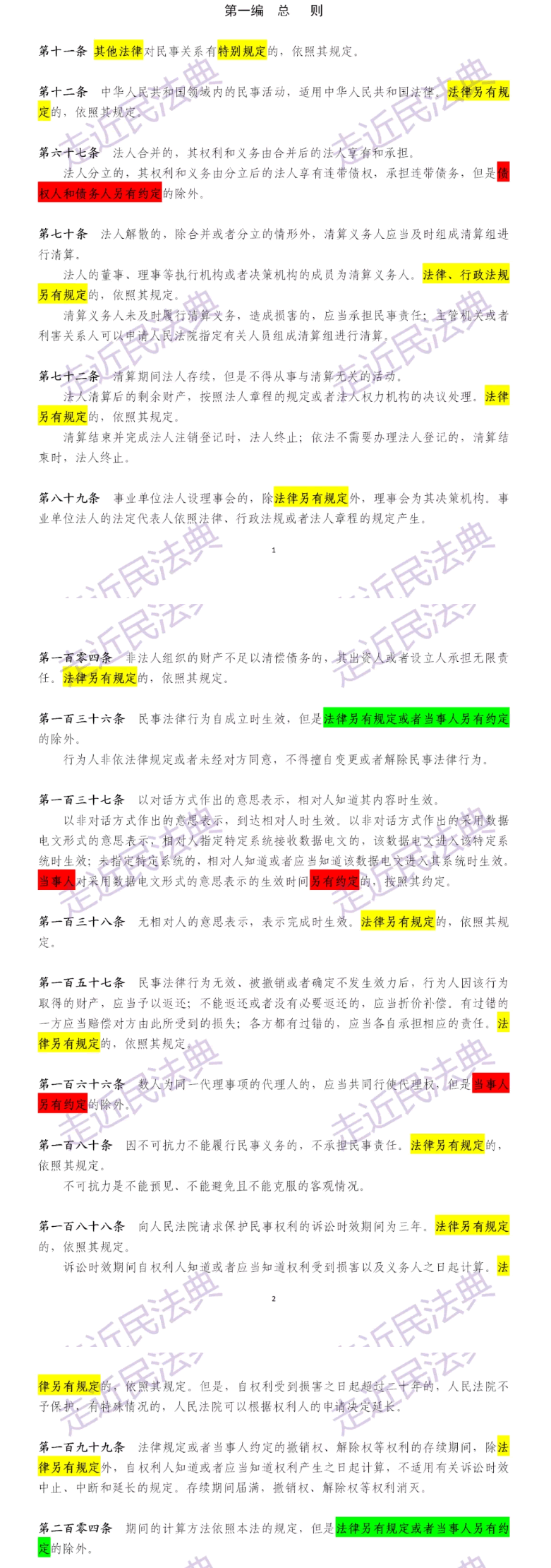 我們應(yīng)當(dāng)注意到,《民法典》之外,還有大量的民法規(guī)范與制度沒有寫進(jìn)來,甚至其他非民事法律中也涉及了民事法律內(nèi)容,這也導(dǎo)致了在《民法典》中,有很多“法律另有規(guī)定除外”條款的存在。此外,基于民法基本原則之一的“意思自治原則”,《民法典》尤其合同編中有很多“當(dāng)事人另有約定的除外”條款。當(dāng)然,也存在二者并存的即“法律另有規(guī)定或當(dāng)事人另有約定除外”的條款。