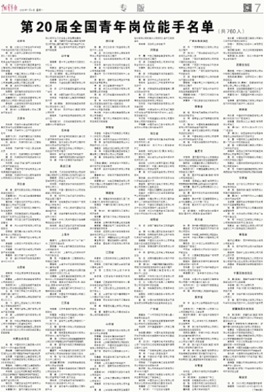 新疆青年崗位能手名單:白軍 賽福丁·伊斯熱依力 張秉忠 楊向陽 梁邦偉 唐永亮 鄭九順 趙強(qiáng)國 殷文娟