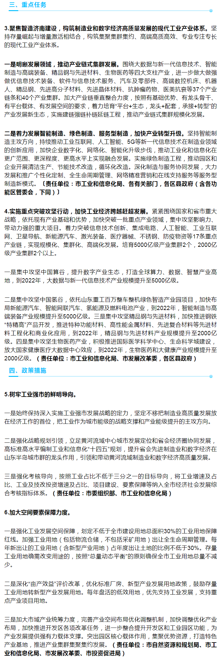 1.總體要求。堅持以新時代中國特色社會主義思想為指導,認真貫徹落實總書記對山東、對濟南工作的重要指示要求,對標對表“走在前列、多面開創(chuàng)”目標定位,按照省委省政府打造“智造濟南”工作要求,堅持新發(fā)展理念,把推動制造業(yè)G質(zhì)量發(fā)展放在經(jīng)濟工作首位,大力實施工業(yè)強市發(fā)展戰(zhàn)略,以智能制造為主攻方向,深化新一代信息技術(shù)與制造業(yè)融合發(fā)展,加快工業(yè)互聯(lián)網(wǎng)創(chuàng)新發(fā)展,加快制造業(yè)生產(chǎn)方式和企業(yè)形態(tài)根本性變革,加快構(gòu)建現(xiàn)代產(chǎn)業(yè)體系。聚力打好產(chǎn)業(yè)基礎(chǔ)G級化、產(chǎn)業(yè)鏈現(xiàn)代化攻堅戰(zhàn),聚焦制造業(yè)優(yōu)化升級、數(shù)字經(jīng)濟引L、服務(wù)實體經(jīng)濟三大重點任務(wù),著力培育創(chuàng)新驅(qū)動、項目帶動、政策促動三大動能,凝心聚力、持之以恒打造先進制造業(yè)和數(shù)字經(jīng)濟G質(zhì)量發(fā)展雙引擎,鞏固提升工業(yè)經(jīng)濟的支柱地位和輻射帶動作用,持續(xù)推動產(chǎn)業(yè)和城市能級雙提升,為建設(shè)“大強美富通”現(xiàn)代化國際大都市提供強大產(chǎn)業(yè)支撐。