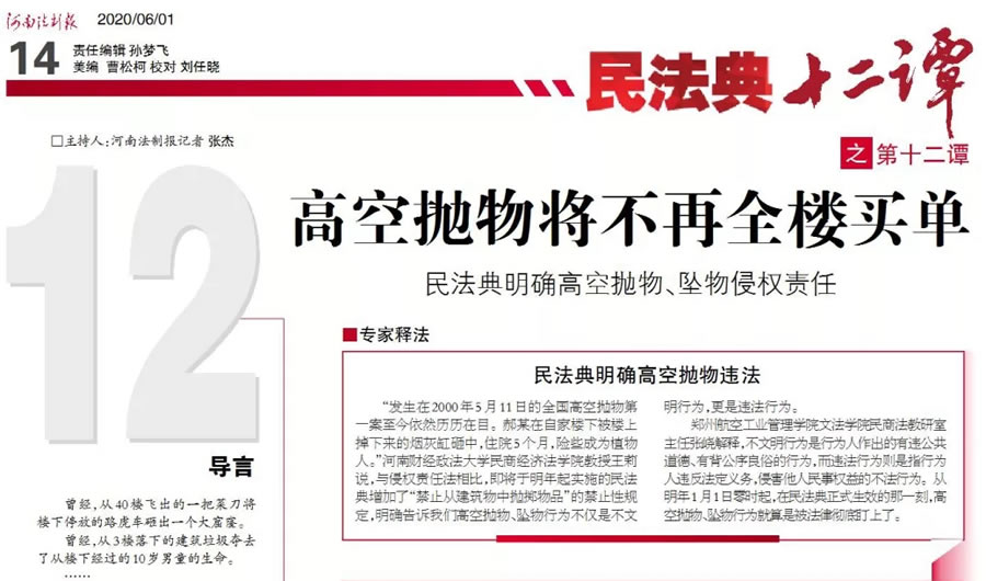 “發(fā)生在2000年5月11日的全國G空拋物D一案至今依然歷歷在目。郝某在自家樓下被樓上掉下來的煙灰缸砸中,住院5個月,險些成為植物人!焙幽县斀(jīng)政法大學(xué)民商經(jīng)濟(jì)法學(xué)院教授王莉說,與侵權(quán)責(zé)任法相比,即將于明年起實(shí)施的民法典增加了“禁止從建筑物中拋擲物品”的禁止性規(guī)定,明確告訴我們G空拋物、墜物行為不僅是不文明行為,更是違法行為。