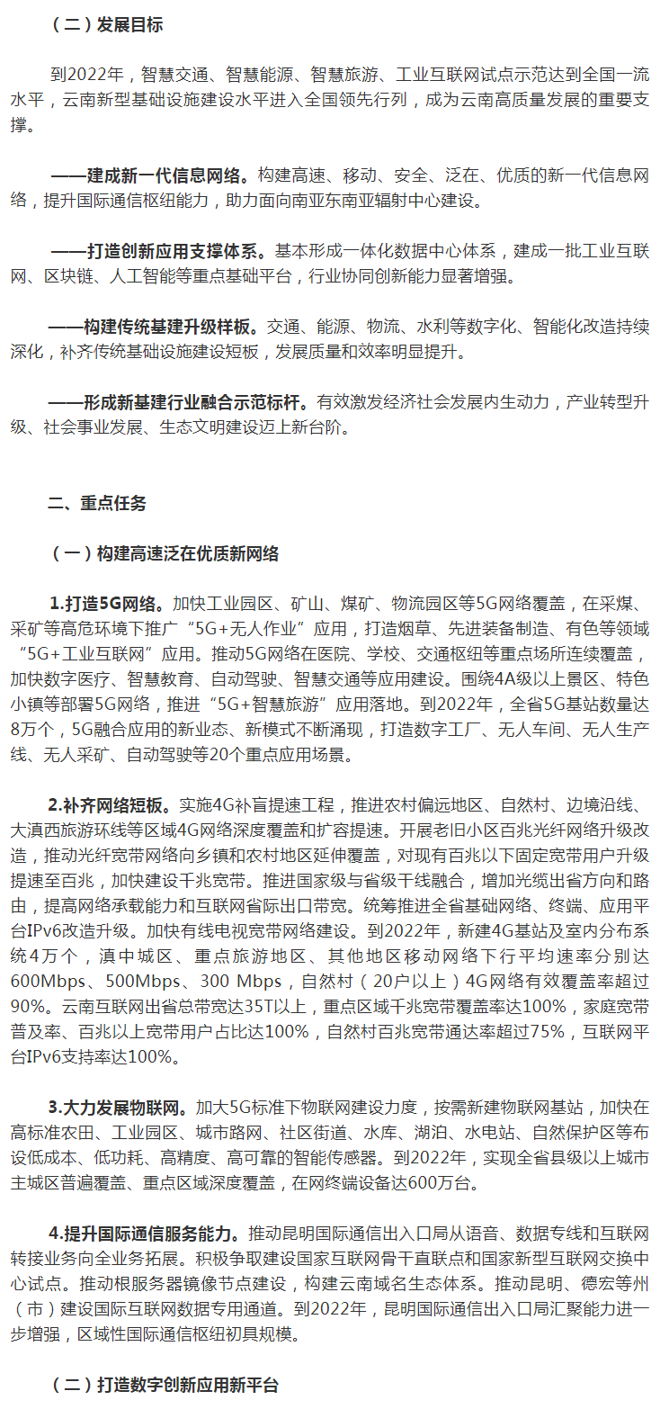 以新時(shí)代中國(guó)特色社會(huì)主義思想為指導(dǎo),深入貫徹落實(shí)總書記考察云南重要講話精神,堅(jiān)持穩(wěn)中求進(jìn)工作總基調(diào),堅(jiān)持新發(fā)展理念,搶抓新型基礎(chǔ)設(shè)施建設(shè)機(jī)遇,瞄準(zhǔn)“國(guó)內(nèi)L先、國(guó)際出色”,遵循“政府引導(dǎo)、市場(chǎng)主體”的原則,建用并舉、以用促建,以整體優(yōu)化、協(xié)同融合為導(dǎo)向,統(tǒng)籌存量和增量、傳統(tǒng)和新型基礎(chǔ)設(shè)施發(fā)展,補(bǔ)齊信息基礎(chǔ)設(shè)施短板,加快布局5G、數(shù)據(jù)中心、工業(yè)互聯(lián)網(wǎng),推動(dòng)傳統(tǒng)基礎(chǔ)設(shè)施升級(jí)改造,促進(jìn)新型基礎(chǔ)設(shè)施與經(jīng)濟(jì)社會(huì)深度融合,充分發(fā)揮新型基礎(chǔ)設(shè)施建設(shè)對(duì)數(shù)字經(jīng)濟(jì)產(chǎn)業(yè)、傳統(tǒng)產(chǎn)業(yè)數(shù)字化的疊加效應(yīng)、乘數(shù)效應(yīng),促進(jìn)產(chǎn)業(yè)繁榮、激發(fā)創(chuàng)新活力,助推云南G質(zhì)量發(fā)展。