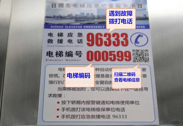 平臺(tái)對(duì)錄入的每臺(tái)電梯都進(jìn)行了準(zhǔn)確定位,并且在轎廂內(nèi)張貼標(biāo)識(shí)牌,標(biāo)識(shí)牌上有電梯應(yīng)急救援電話“96333”以及每臺(tái)電梯對(duì)應(yīng)的編號(hào)。市民乘坐電梯偶遇故障被困時(shí),可撥打“96333”救援熱線電話,告知接線人員電梯編碼,即可對(duì)所乘電梯的所在小區(qū)、單元樓實(shí)施迅速定位,安排專業(yè)人員前去救援。市民在日常乘梯時(shí)也可憑借96333應(yīng)急處置平臺(tái)的數(shù)據(jù)歸集,掃描標(biāo)識(shí)牌二維碼,獲知電梯檢驗(yàn)、維保、投保、管理等情況,參與電梯安全管理社會(huì)共治。