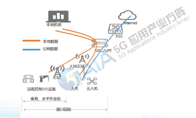案例整體采用SA組網,在港口區(qū)域部署大網宏站和專用宏站,提供港口生產業(yè)務的頻率專用服務,通過接入控制方案保障其它用戶無法接入專網小區(qū),大大增強其業(yè)務性能(如時延、可靠性、速率)保障效果;目前已完成多個堆場連續(xù)覆蓋,滿足港口對速率、時延、可靠性、安全隔離等方面需求。核心網部署專用5GC核心網切片,將UPF下沉至港口區(qū),保障港口敏感 業(yè)務的數(shù)據安全隔離性,其余核心網設備位于運營商機房,物理設備與其他項目共享,通過切片進行虛 擬隔離。港機PLC等港口設備通過CPE接入5G網絡,港區(qū)內的人員和無人機等則通過5G基站直接接入。