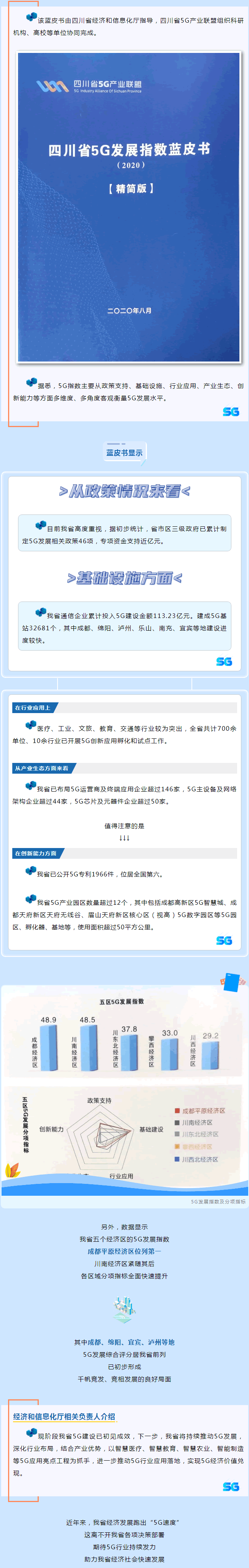 四川省5G產(chǎn)業(yè)聯(lián)盟牽頭編制的《四川省5G發(fā)展指數(shù)藍皮書(2020版)》(下簡稱:5G發(fā)展指數(shù))首次發(fā)布。此次發(fā)布的藍皮書由省經(jīng)濟和信息化廳指導,四川省5G產(chǎn)業(yè)聯(lián)盟組織科研機構、G校等單位協(xié)同完成。該藍皮書顯示,四川5G建設已初見成效:通信企業(yè)累計投入5G建設金額113.23億元;在創(chuàng)新能力方面,已公開5G專利1966件,位居全國第六,5G產(chǎn)業(yè)園區(qū)數(shù)量超過12個;在產(chǎn)業(yè)生態(tài)方面,已布局5G運營商及終端應用企業(yè)超146家,5G主設備及網(wǎng)絡架構企業(yè)超44家,5G芯片及元器件企業(yè)超50家。