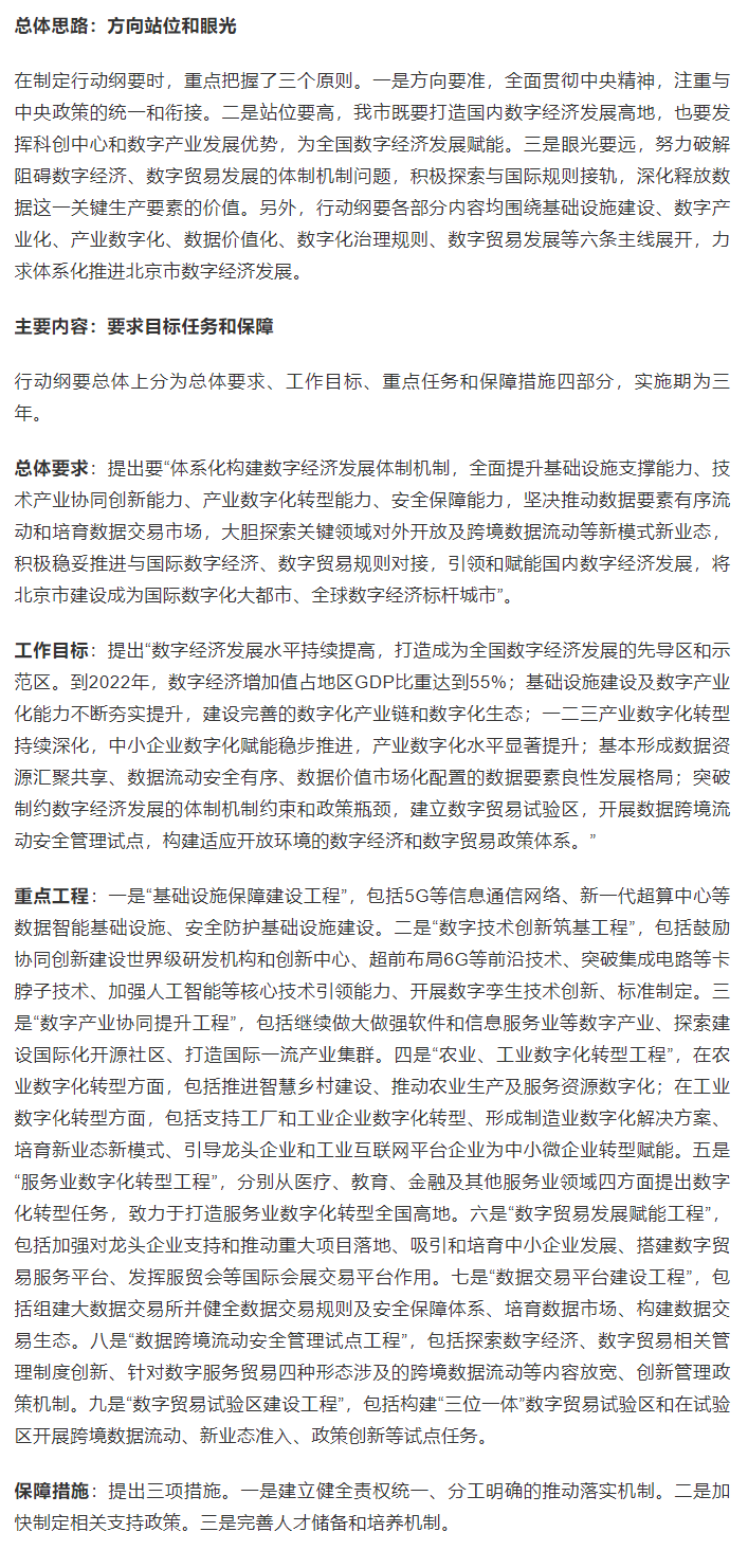 《北京市促進(jìn)數(shù)字經(jīng)濟(jì)創(chuàng)新發(fā)展行動(dòng)綱要(2020-2022年)》(以下簡(jiǎn)稱《剛要》),經(jīng)北京市人民政府同意,相關(guān)部門于9月7日召開(kāi)了新聞發(fā)布會(huì)正式予以發(fā)布。