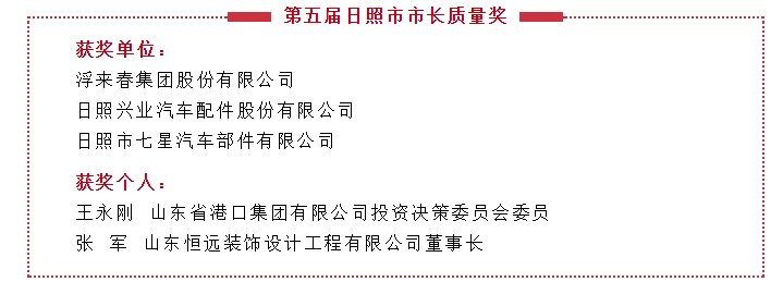 第五屆日照市市長(zhǎng)質(zhì)量獎(jiǎng)名單,共有3家單位和2名個(gè)人獲獎(jiǎng)!