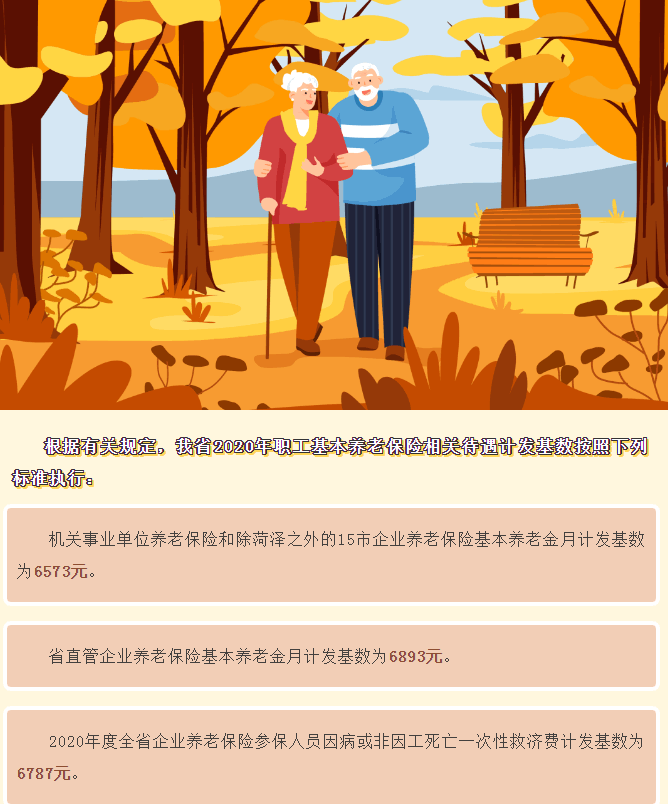 機(jī)關(guān)事業(yè)單位養(yǎng)老保險(xiǎn)和除菏澤之外的15市企業(yè)養(yǎng)老保險(xiǎn)基本養(yǎng)老金月計(jì)發(fā)基數(shù)為6573元。