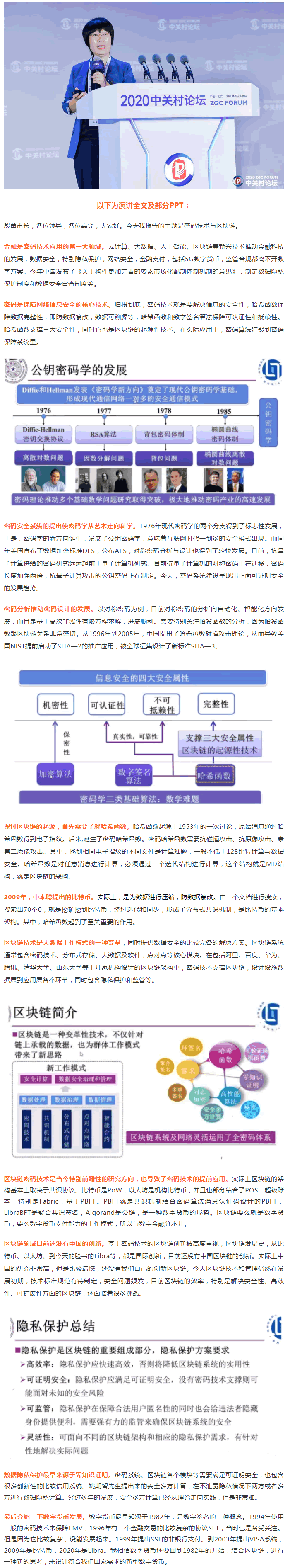 在2020中關(guān)村論壇上,中國(guó)科學(xué)院院士,國(guó)際密碼協(xié)會(huì)會(huì)士(IACRFellow),清華大學(xué)G等研究院“楊振寧講座”教授王小云發(fā)表《密碼技術(shù)與區(qū)塊鏈》主題演講。