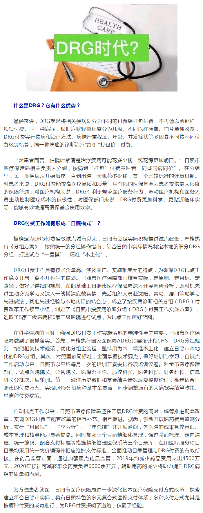 一直以來,傳統(tǒng)的“按項(xiàng)目付費(fèi)”方式被認(rèn)為是導(dǎo)致過度醫(yī)療、大處方的重要原因之一,在浪費(fèi)醫(yī)療資源的同時(shí)也加重了老百姓就醫(yī)負(fù)擔(dān),呼吁改革的聲音不斷。為健全醫(yī)保支付機(jī)制,激發(fā)醫(yī)療機(jī)構(gòu)規(guī)范行為、控制成本的內(nèi)生動(dòng)力,去年5月,國家醫(yī)保局啟動(dòng)按疾病診斷相關(guān)分組(DRG)付費(fèi)試點(diǎn),山東省在組織青島市參加國家試點(diǎn)的同時(shí),首批選取10個(gè)市開展DRG付費(fèi)省級(jí)試點(diǎn),日照市位列其中。