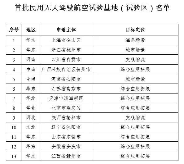 為探索新時代政府監(jiān)管服務(wù)的新方式,形成促進(jìn)無人駕駛航空行業(yè)管理與社會管理深度融合的新路徑,在體制機(jī)制、政策法規(guī)等方面先行先試,有序開展我國民用無人駕駛航空試點(diǎn)示范工作,根據(jù)《民用無人駕駛航空試驗(yàn)基地(試驗(yàn)區(qū))建設(shè)工作指引》(民航發(fā)﹝2020﹞26號)相關(guān)要求,經(jīng)過民航各地區(qū)管理局初審共計(jì)35個直轄市、副省級城市、地級市(區(qū))向民航局報送了試驗(yàn)基地(試驗(yàn)區(qū))建設(shè)申請及建設(shè)方案。結(jié)合民用無人駕駛航空試驗(yàn)基地(試驗(yàn)區(qū))總體布局和重點(diǎn)任務(wù),經(jīng)過預(yù)審、答辯及實(shí)地考察三個環(huán)節(jié)的綜合論證,民航局批準(zhǔn)首批共13個民用無人駕駛航空試驗(yàn)基地(試驗(yàn)區(qū))(名單見附件1),現(xiàn)予以公布。