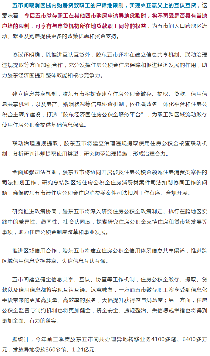 根據(jù)協(xié)議,膠東五市住房公積金部門(mén)將深入推進(jìn)互認(rèn)互貸,推動(dòng)住房公積金轉(zhuǎn)移接續(xù)和繳存信息互認(rèn),在尊重五市具體政策措施的基礎(chǔ)上,取消區(qū)域內(nèi)購(gòu)房貸款職工戶(hù)籍地限制,確保申請(qǐng)異地貸款的職工與申貸機(jī)構(gòu)所在地貸款職工享有同等權(quán)益。