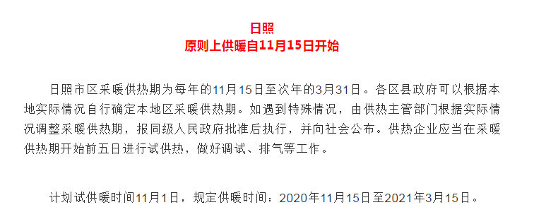 日照主城區(qū)試供熱,11月15日起達(dá)標(biāo)供熱,供熱時(shí)間為11月15日至次年的3月31日,