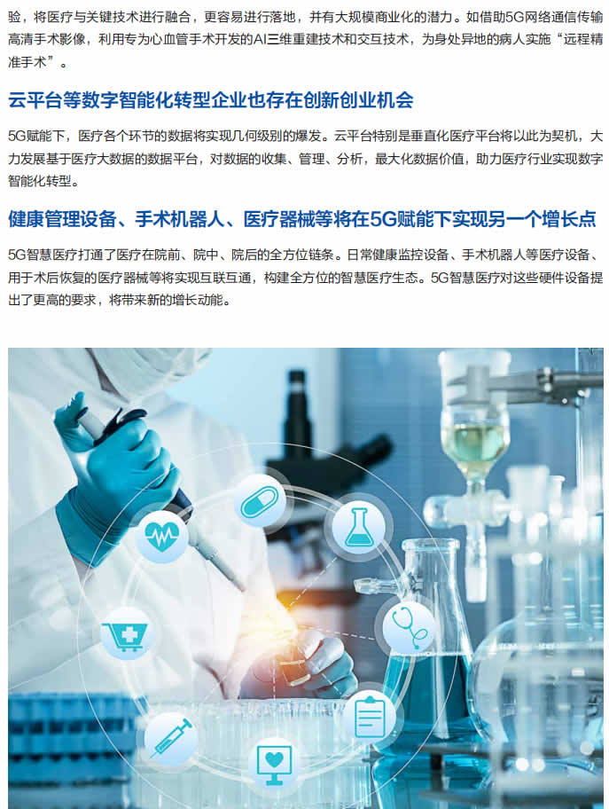 “5G+醫(yī)療健康”將實(shí)現(xiàn)醫(yī)生從在醫(yī)院到在云端,醫(yī)療設(shè)備從醫(yī)院內(nèi)到隨身攜帶,從院內(nèi)全連接到少量設(shè)備 遠(yuǎn)程化,再到設(shè)備普遍遠(yuǎn)程化。便攜式、無線化醫(yī)療設(shè)備資源逐步從大型醫(yī)療機(jī)構(gòu)走近基層醫(yī)療機(jī)構(gòu)和個(gè)人家 庭;大型醫(yī)院院內(nèi)醫(yī)療服務(wù)走向無線化和智能化;實(shí)體大型醫(yī)院從支持院間遠(yuǎn)程醫(yī)療發(fā)展成為面向醫(yī)聯(lián)體、社 區(qū)、家庭的醫(yī)療服務(wù)網(wǎng);互聯(lián)網(wǎng)醫(yī)院實(shí)現(xiàn)線上線下對接;實(shí)體大醫(yī)院主導(dǎo)的遠(yuǎn)程醫(yī)療和OTT主導(dǎo)的互聯(lián)網(wǎng)醫(yī) 療逐步走向融合的新醫(yī)療。
