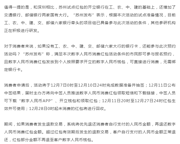 根據(jù)“蘇州發(fā)布”,此次“雙12蘇州購(gòu)物節(jié)”數(shù)字人民幣消費(fèi)紅包將采取“搖號(hào)抽簽”形式發(fā)放,非先到先得,無(wú)需爭(zhēng)搶。抽簽報(bào)名通道自2020年12月5日0時(shí)正式開(kāi)啟,持續(xù)至12月6日24時(shí)。