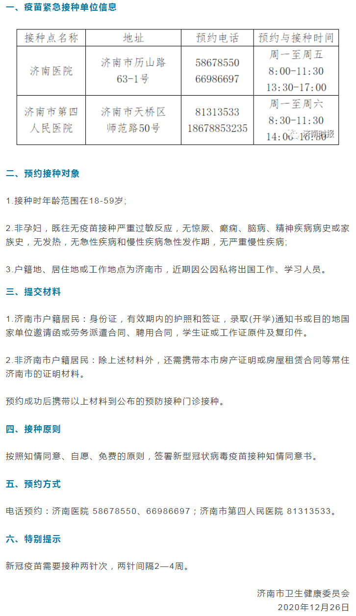 濟(jì)南新G疫苗接種點(diǎn)電話,濟(jì)南醫(yī)院 58678550、66986697;濟(jì)南市第四人民醫(yī)院 81313533,濟(jì)南市衛(wèi)生健康委員會(huì)