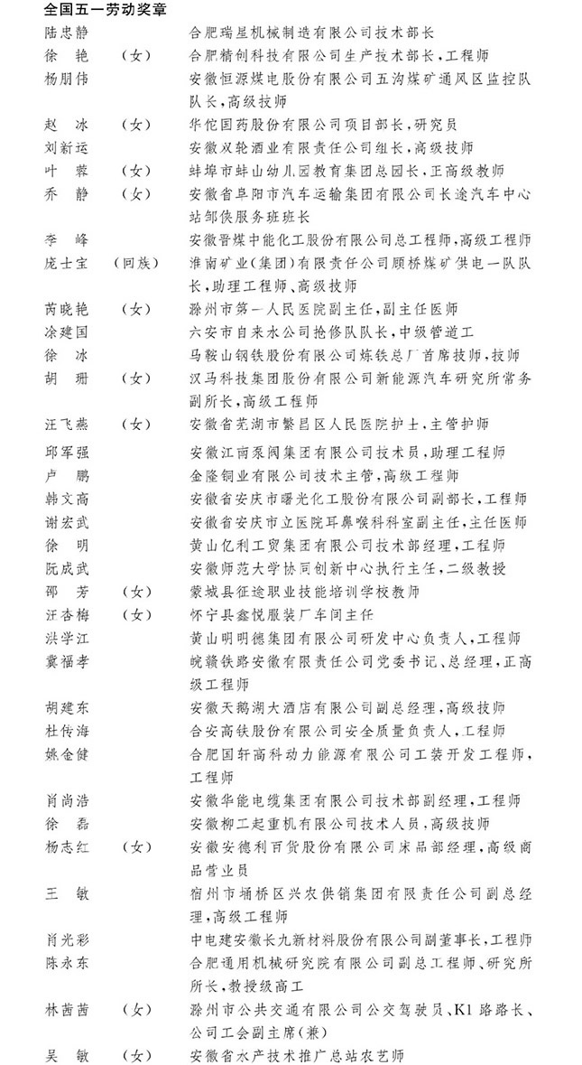 2021年安徽省全國(guó)五一勞動(dòng)獎(jiǎng)?wù)芦@得者名單