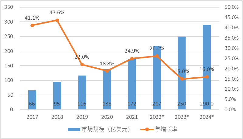 預計 2022 年, 服務機器人市場規(guī)模達到 217 億美元。 2024 年, 全 球服務機器人市場規(guī)模將有望增長到 290 億美元。