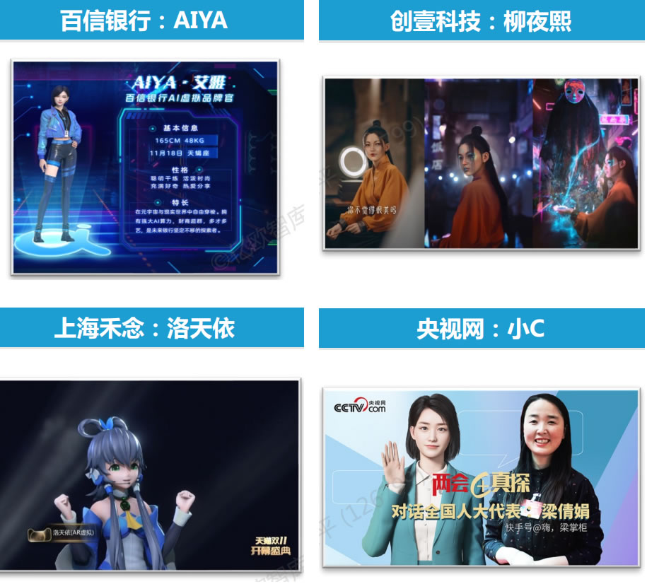 央視虛擬主播小C 冬奧宣推官虛擬主播冬冬 歌手洛天依 博主柳夜熙 AYAYI 虛擬偶像翎Ling 清華學(xué)生華智冰 虛擬人蘇小妹 航天員小浄 藝術(shù)家哈醬