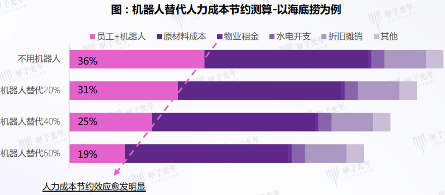 3 按每臺(tái)機(jī)器人替代2-3名傳菜員來(lái)看,餐飲機(jī)器人的應(yīng)用可將海底撈的員工成本占比由36%減低到31%