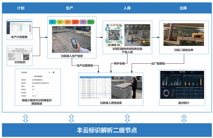江蘇豐尚智能科技有限公司基于上述痛點,與江蘇華晟新型建筑科技有限公司展開合作, 開發(fā)基于標(biāo)識的生產(chǎn)質(zhì)資及倉庫管理平臺,將項目信息,構(gòu)件分類,批次,生產(chǎn)工藝等提前錄 入系統(tǒng),對接標(biāo)識解析體統(tǒng)生成符合要求的標(biāo)識碼。系統(tǒng)結(jié)合生產(chǎn)數(shù)據(jù)的任務(wù)工作蠹,按照工 程建造的構(gòu)件安裝需求進(jìn)度以及工廠既有產(chǎn)能和生產(chǎn)流程,制定工廠構(gòu)件生產(chǎn)計劃。按生產(chǎn) 線、項目、樓號、樓層、構(gòu)件類型,形成日生產(chǎn)任務(wù)單,提前規(guī)劃生產(chǎn)所需用料。生產(chǎn)過程 中,用戶可通過二維碼對構(gòu)件生產(chǎn)工藝、構(gòu)件信息進(jìn)行追溯、跟蹤與管理。構(gòu)件生產(chǎn)完成之 后,通過出色程一掃碼步驟完成質(zhì)檢、貨運、信息錄入等多流程的實時記錄。庫位和構(gòu)件信息 都可以通過PDA端程序?qū)崟r查詢。方便臨檢或盤點人員盤點。該平臺部署以來,幫助裝配式建 筑全生命周期信息共享和傳遞,排產(chǎn)計劃準(zhǔn)確率提升12%,基于數(shù)據(jù)分析大幅提G產(chǎn)品質(zhì)量, 簡化出入庫流程,出入庫時間縮減30%左右。