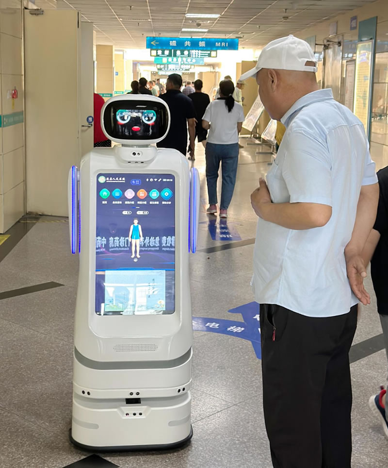 ?h人民醫(yī)院門診大廳有一位特殊的導(dǎo)診員,剛一亮相,就憑借一副呆萌的模樣引起群眾圍觀。它就是剛落戶醫(yī)院的導(dǎo)診機(jī)器人“創(chuàng)創(chuàng)”。它用風(fēng)趣的語(yǔ)言、準(zhǔn)確的應(yīng)答、熱情的講解,為前來(lái)咨詢的患者提供推薦診室、醫(yī)生介紹、掛號(hào)繳費(fèi)、就診指導(dǎo)、科室引L、健康宣教等多功能導(dǎo)診服務(wù),它能通過(guò)導(dǎo)航引路,帶L患者到達(dá)想去的目的地,只要站到導(dǎo)診機(jī)器人面前說(shuō)出想咨詢的問(wèn)題,它便可以準(zhǔn)確地做出應(yīng)答。